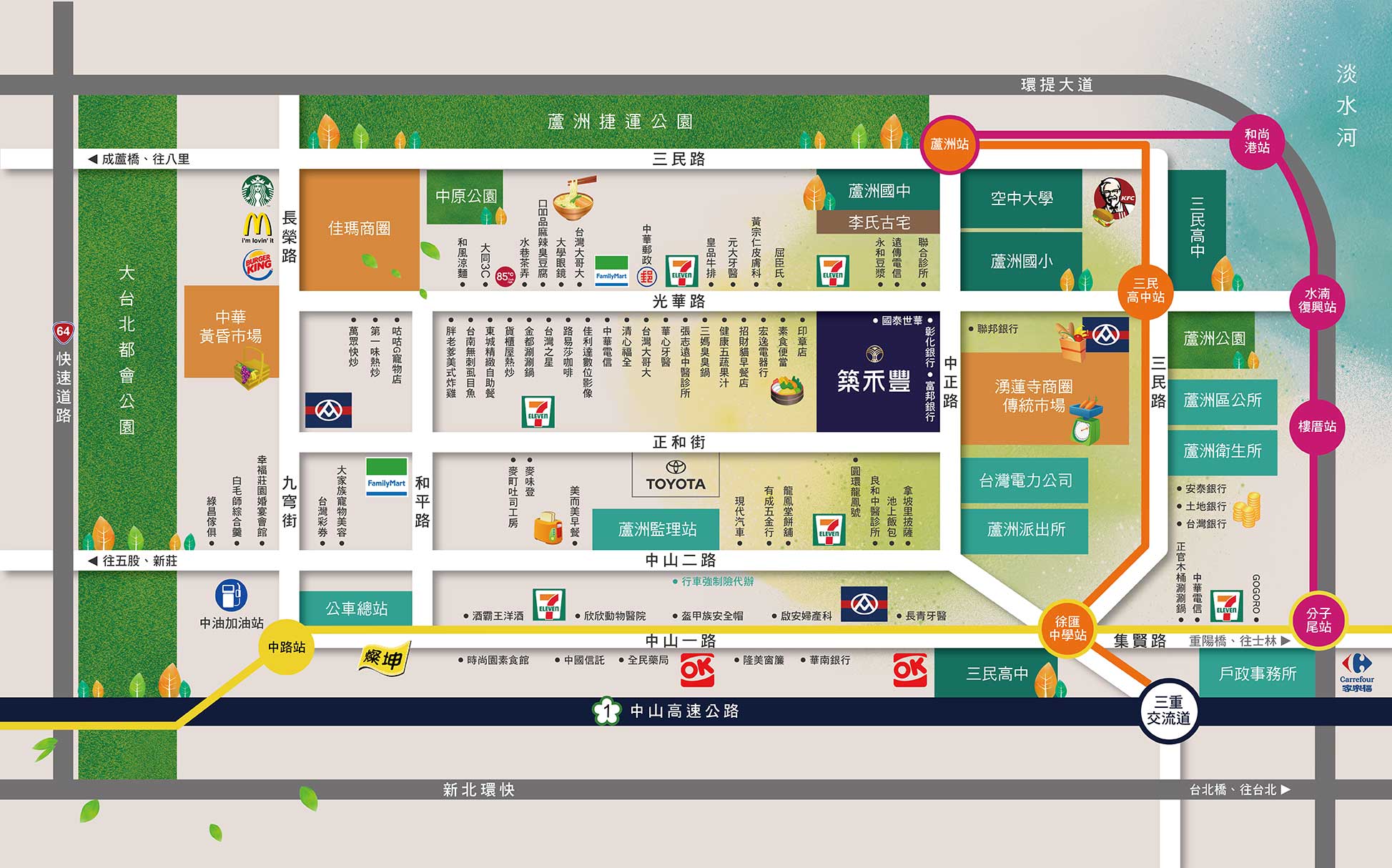 鄰近蘆洲市場、早市、夜市,傳統熱鬧商圈,在地數十年傳家老字號、各式小吃商家,只需步行6分鐘。寬敞、明亮、舒適的消費空間,輕鬆買齊生鮮蔬果食材與日用雜貨。